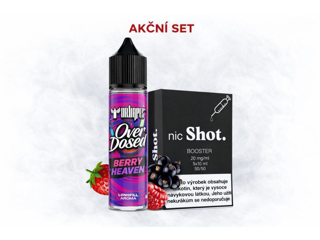 Prémiový Starter Pack: Dr. Vapes Overdosed Berry Heaven + 5× nikotinový booster nicShot. 20 mg (PG/VG 50/50). Stačí smíchat a vapovat ovocný mix jahod, malin a borůvek!